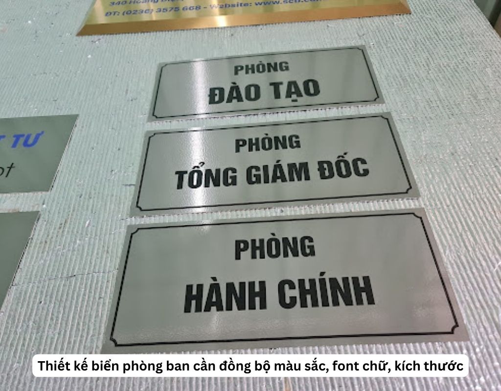 Một trong những yếu tố quan trọng khi thiết kế hệ thống biển phòng ban là sự đồng bộ. Các yếu tố như kích thước biển, font chữ và kích thước chữ phải được thống nhất để tạo nên một tổng thể hài hòa. Dùng các màu sắc gắn liền với bộ nhận diện thương hiệu của công ty để tăng thêm tính nhận diện và đảm bảo sự thống nhất trong toàn bộ không gian.